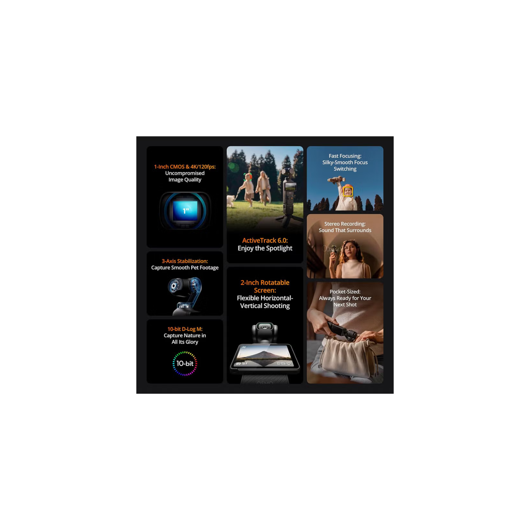 The all-new Pocket 3 features a powerful 1-inch CMOS sensor that puts detail-rich imaging right in the palm of your hand. With a 2-inch rotatable touchscreen and full-pixel fast focusing, go horizontal or vertical for more precise awareness and control. 4K/120fps, three-axis mechanical stabilization, and a host of intelligent features make Pocket 3 ready for any moving moment. The 1-inch CMOS sensor captures clear highlight-shadow details, delivering amazing footage even in low-light scenarios. With 4K/120fps capability, savor every breathtaking moment in slow motion.10-bit D-Log M and HLG, record landscapes with professional-level color flexibility for true-to-life colors and a full-spectrum visual experience.